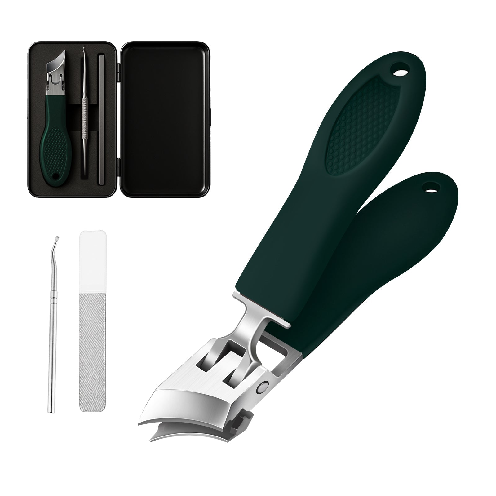 Erleben Sie Maniküre-Qualität wie im Salon – ganz bequem zu Hause. Unser gewinkelter Nagelschneider verfügt über eine gebogene Metallklinge, die sowohl Finger- als auch Fußnägel präzise und sauber schneidet, ganz ohne herumfliegende Späne.